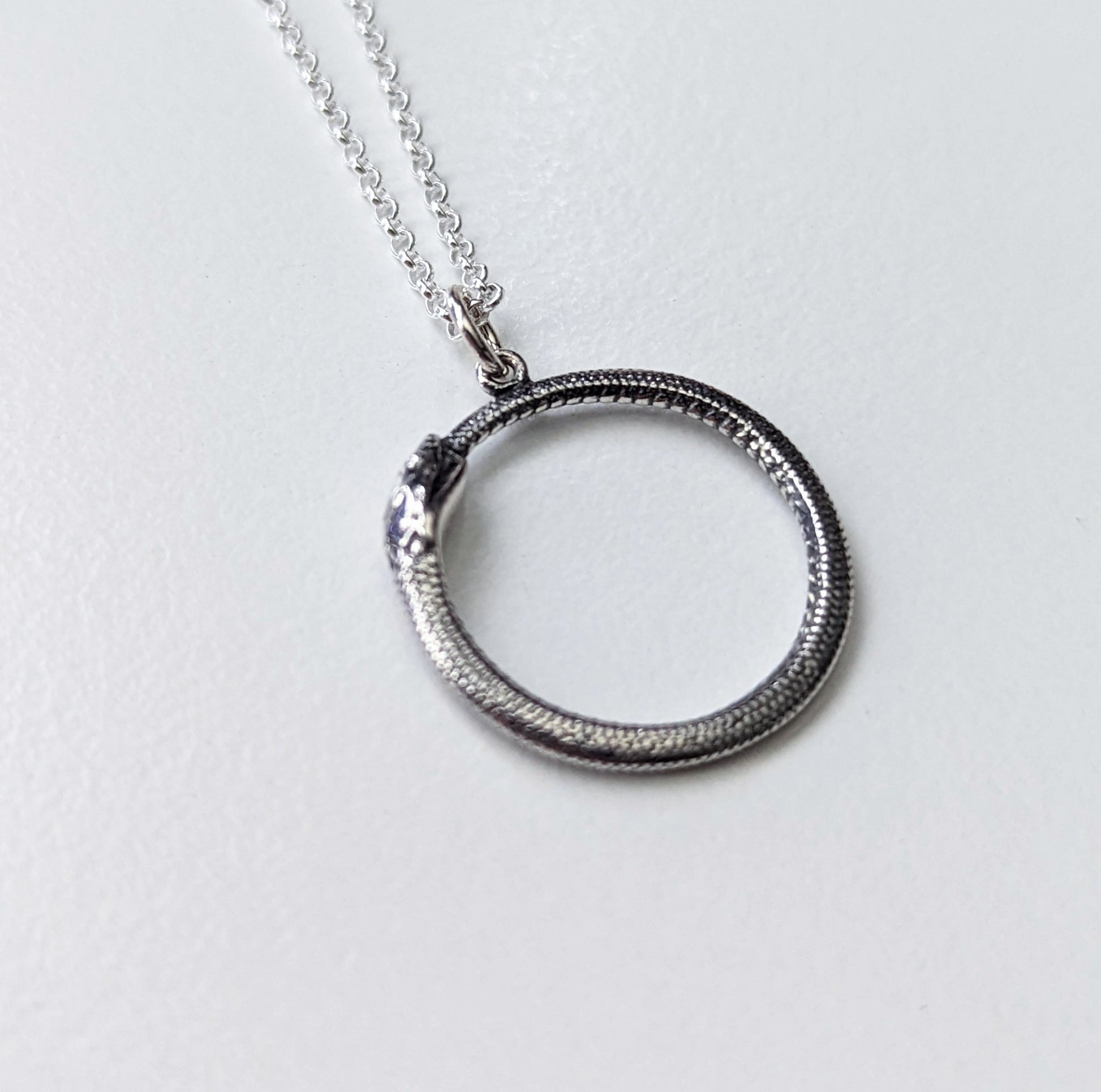 A gorgeously detailed 26x21mm sterling silver ouroboros pendant hanging from a sterling silver chain.