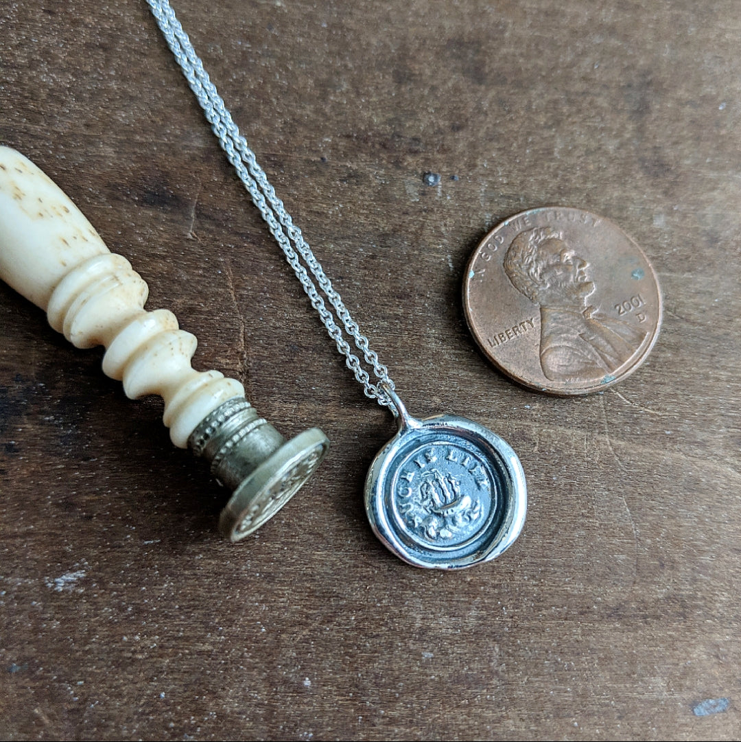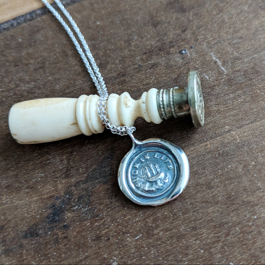 This 1/2" tall sterling silver charm is made from an antique wax seal that was hand carved in the 1800's. This charm says "Such Is Life" and has a ship on the water, it hangs from a sterling silver chain.