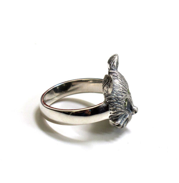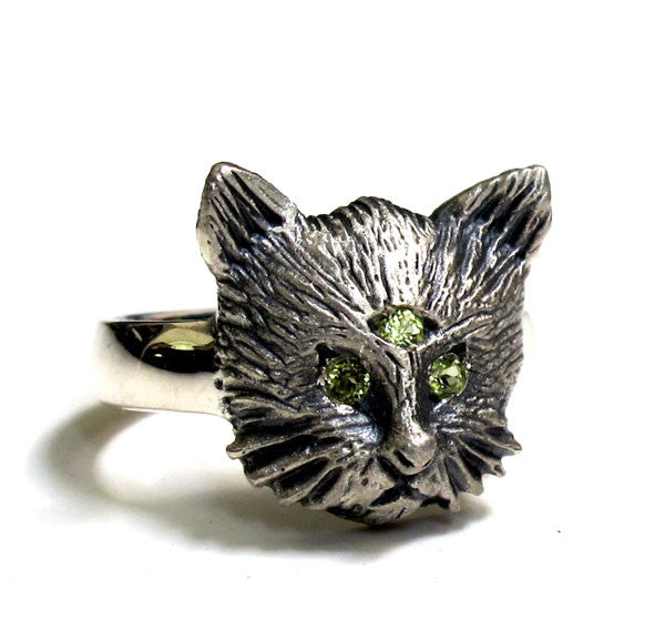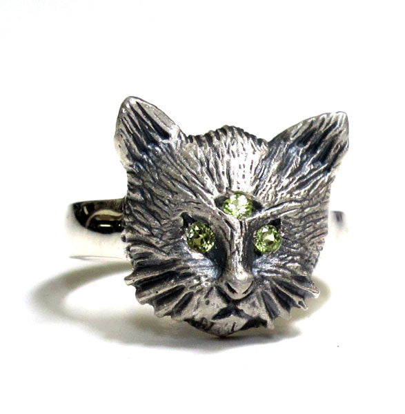 Hand carved three eyed cat pendant cast in sterling silver and oxidized for an aged look with a peridot stone set in each eye on a sterling band.