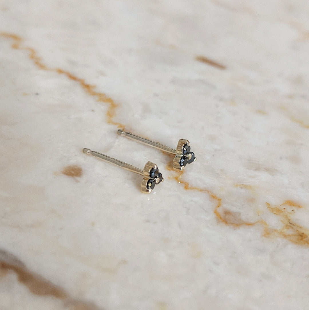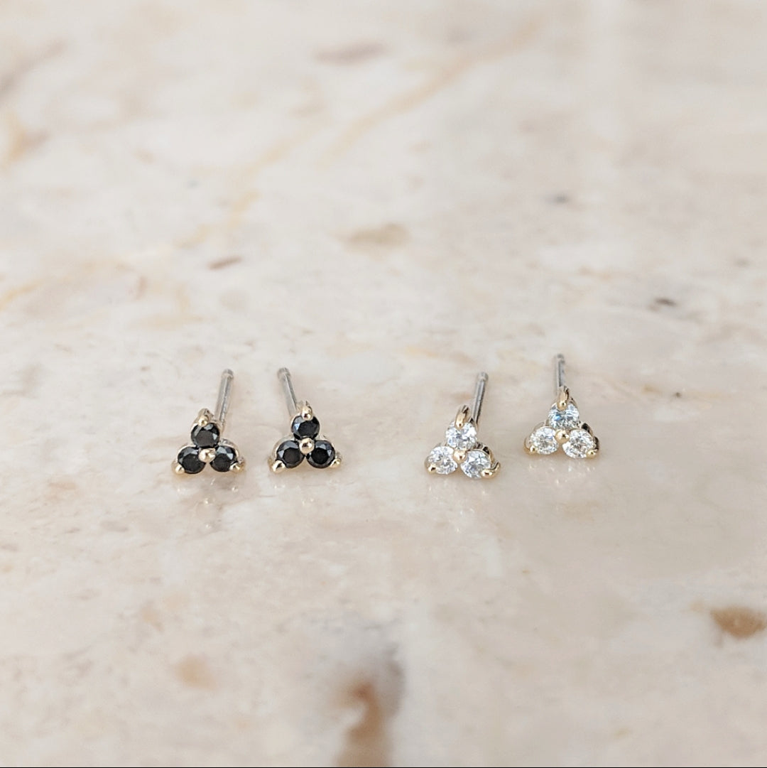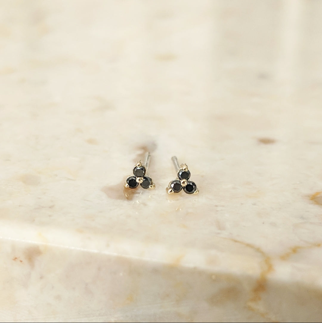A cluster of your choice of three 1.5mm wide opal, black diamond, or white diamonds on 10k gold ear posts.