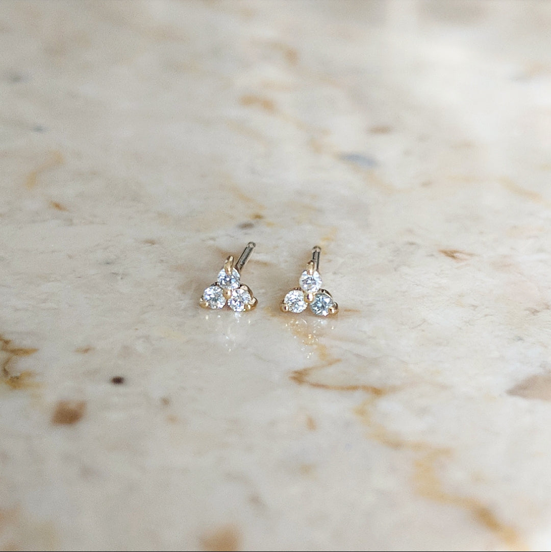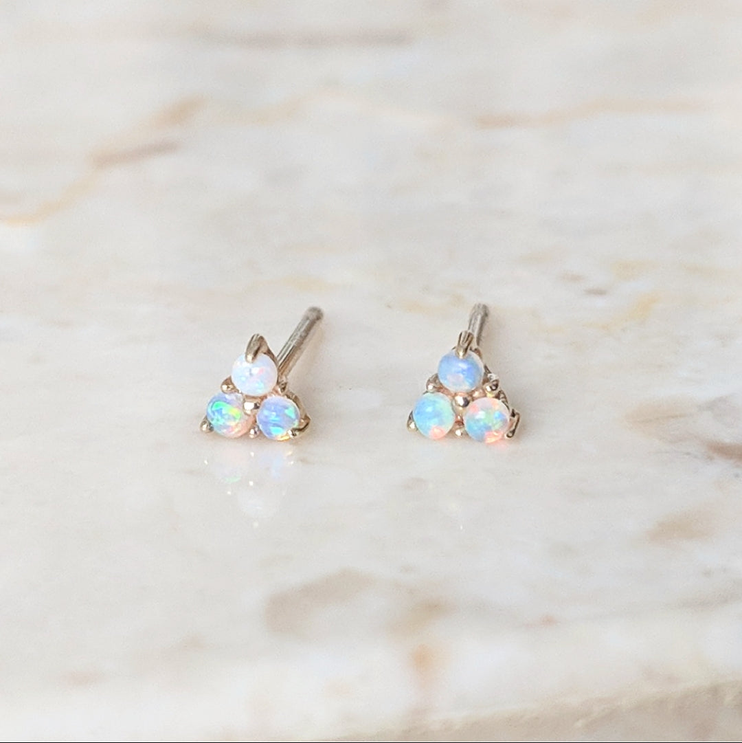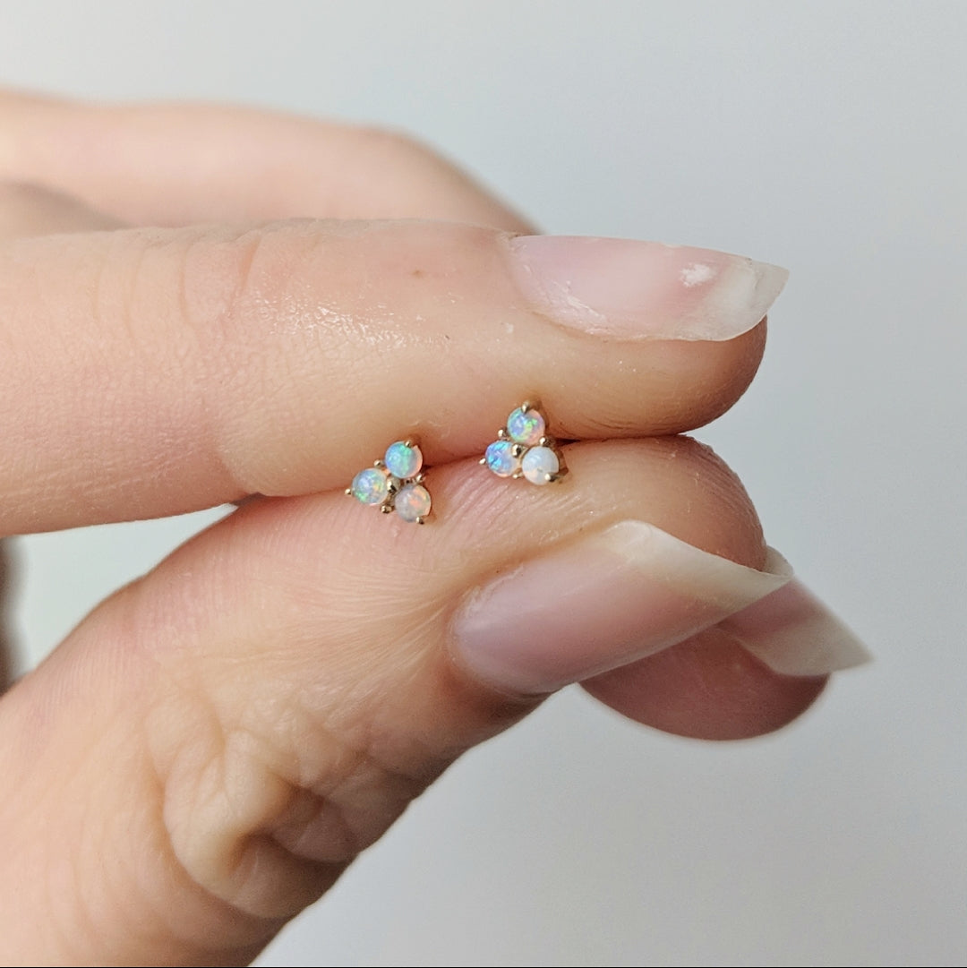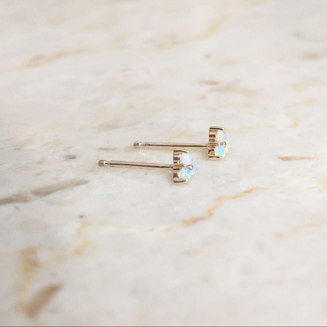 A cluster of your choice of three 1.5mm wide opal, black diamond, or white diamonds on 10k gold ear posts.