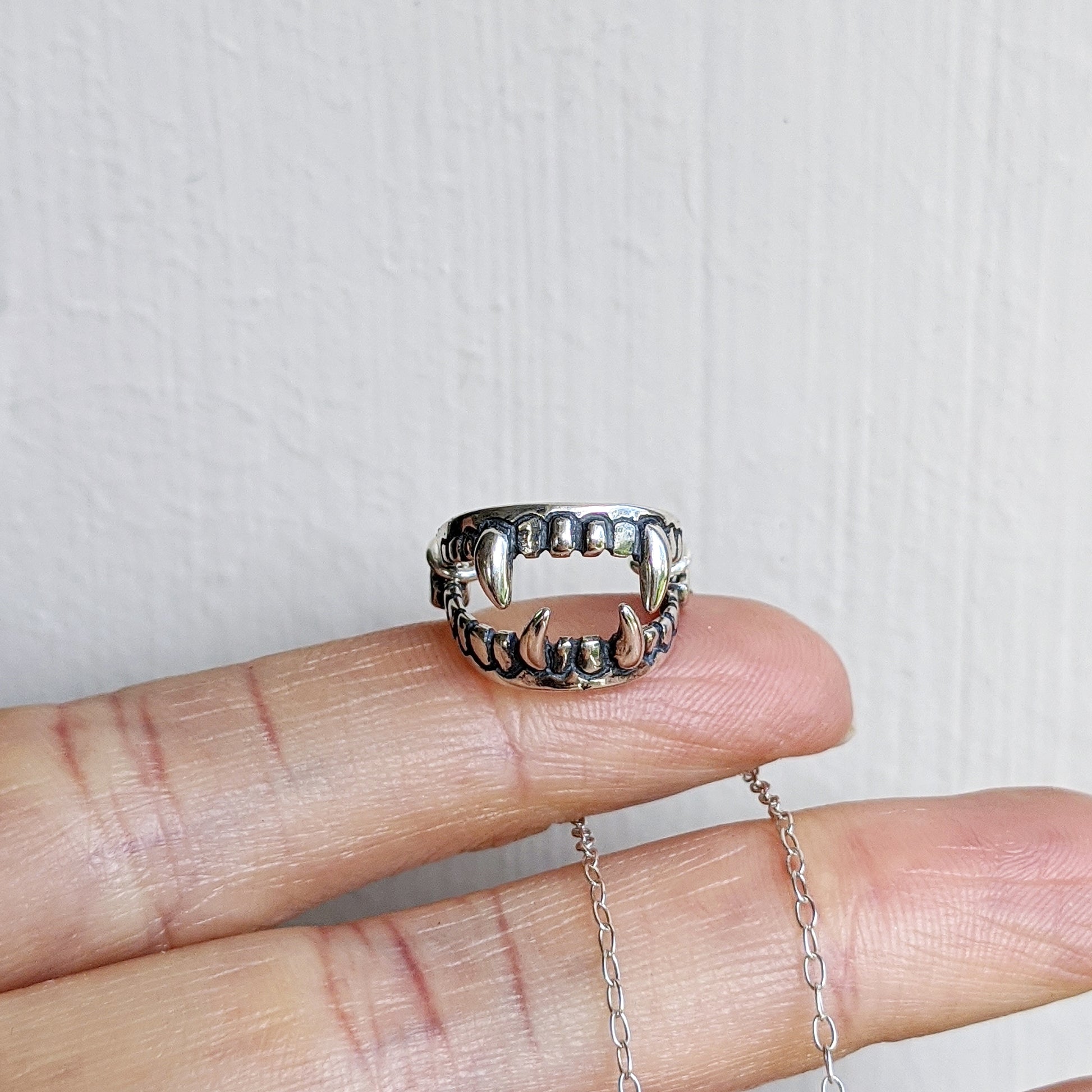 Sterling silver opening and closing vampire ganging hanging from a 17" sterling silver chain. If you need the chain longer or shorter make note of the length needed in the notes section upon checkout.