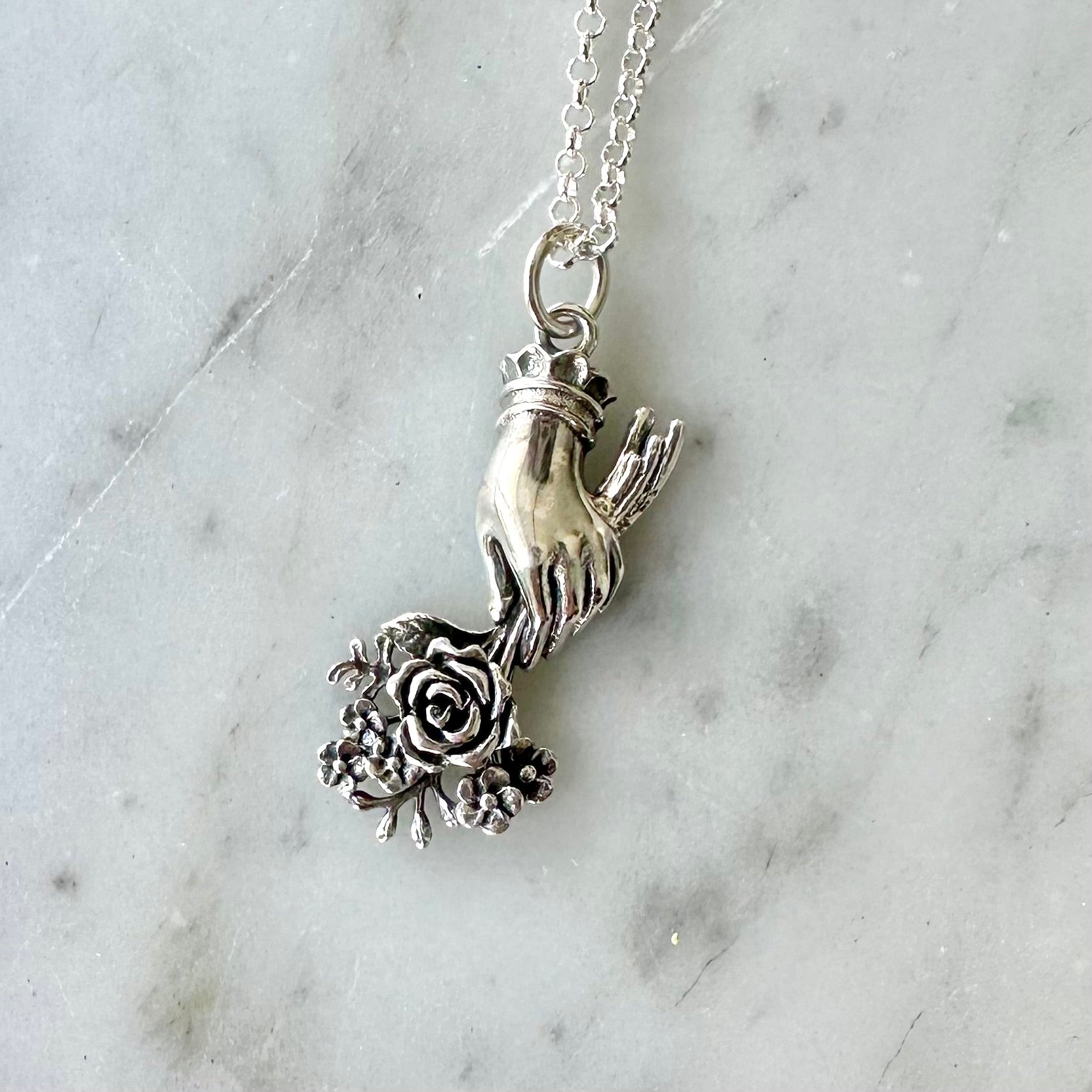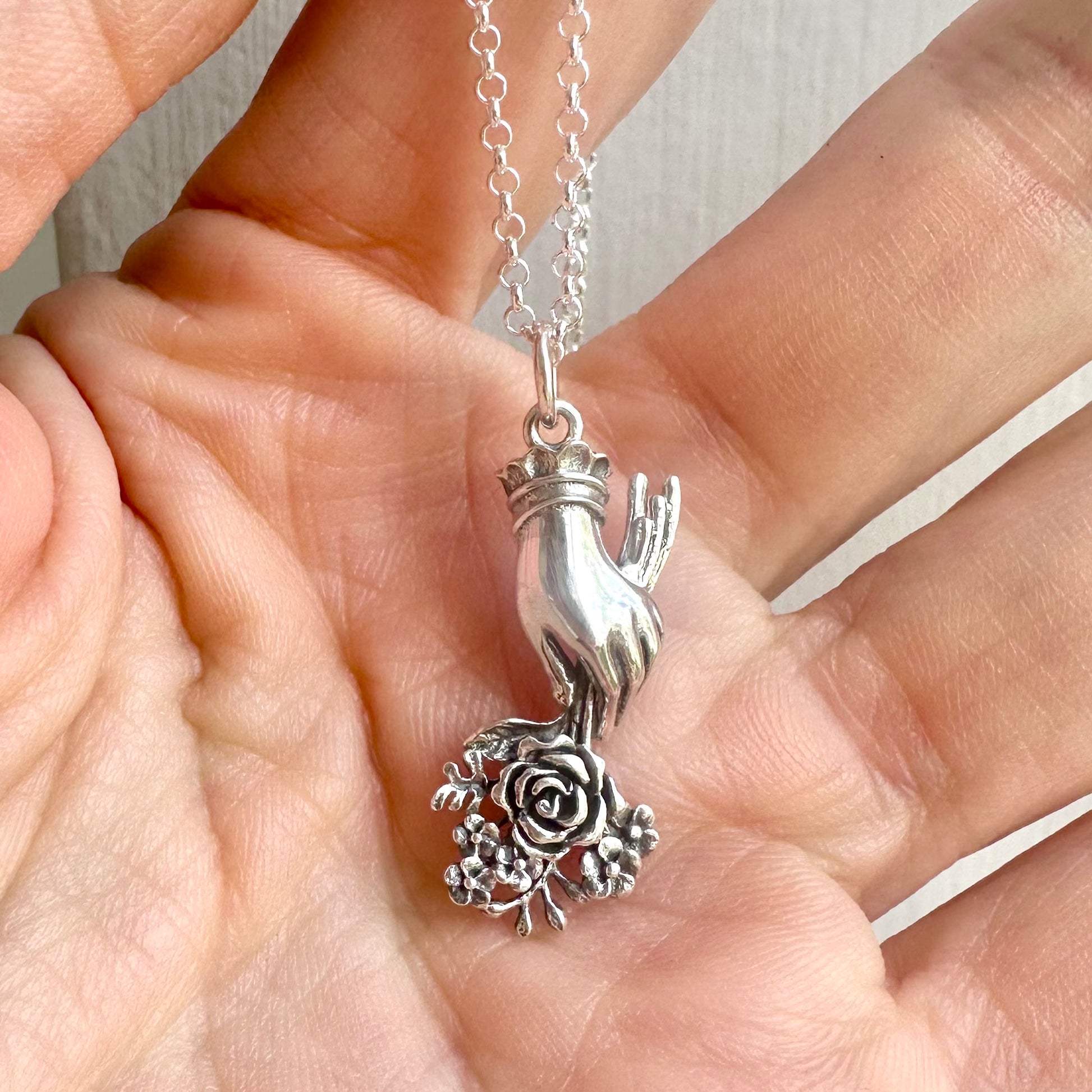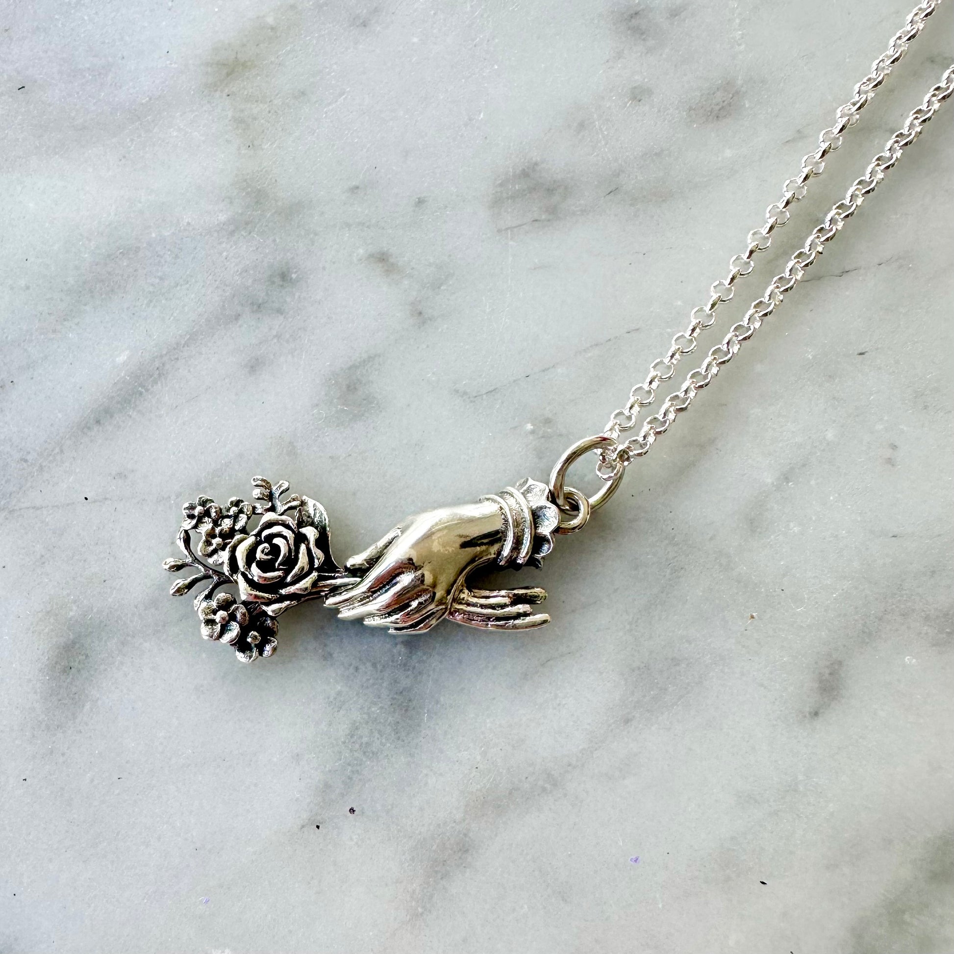 Sterling silver Victorian mourning bouquet charm hanging from a sterling silver chain.