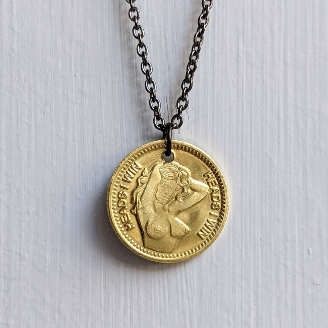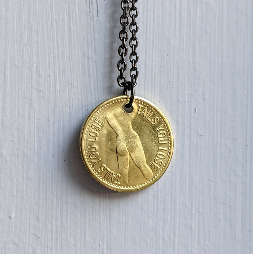 Vintage brass naughty heads and tails flipper coin hanging from a black rhodium plated chain.