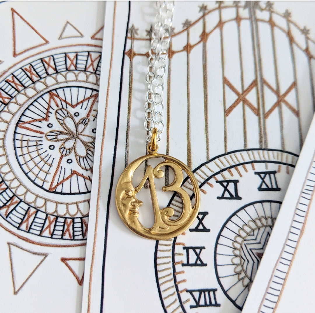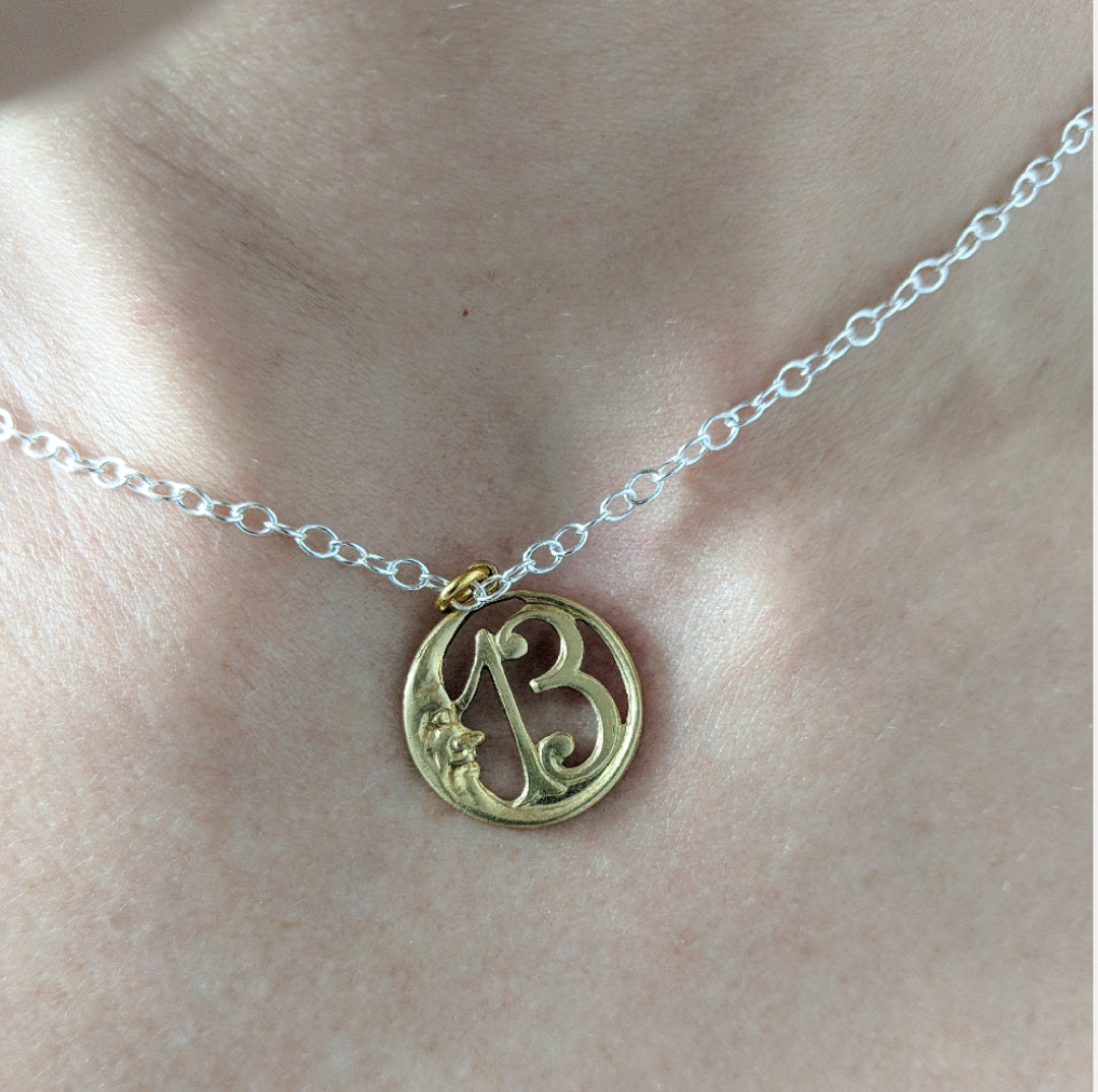 Vintage 1" tall brass pendant hanging from a sterling silver chain.