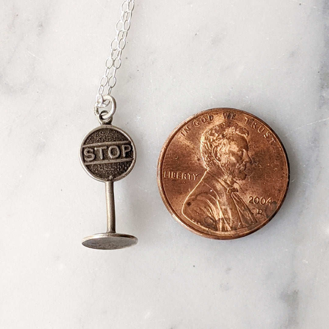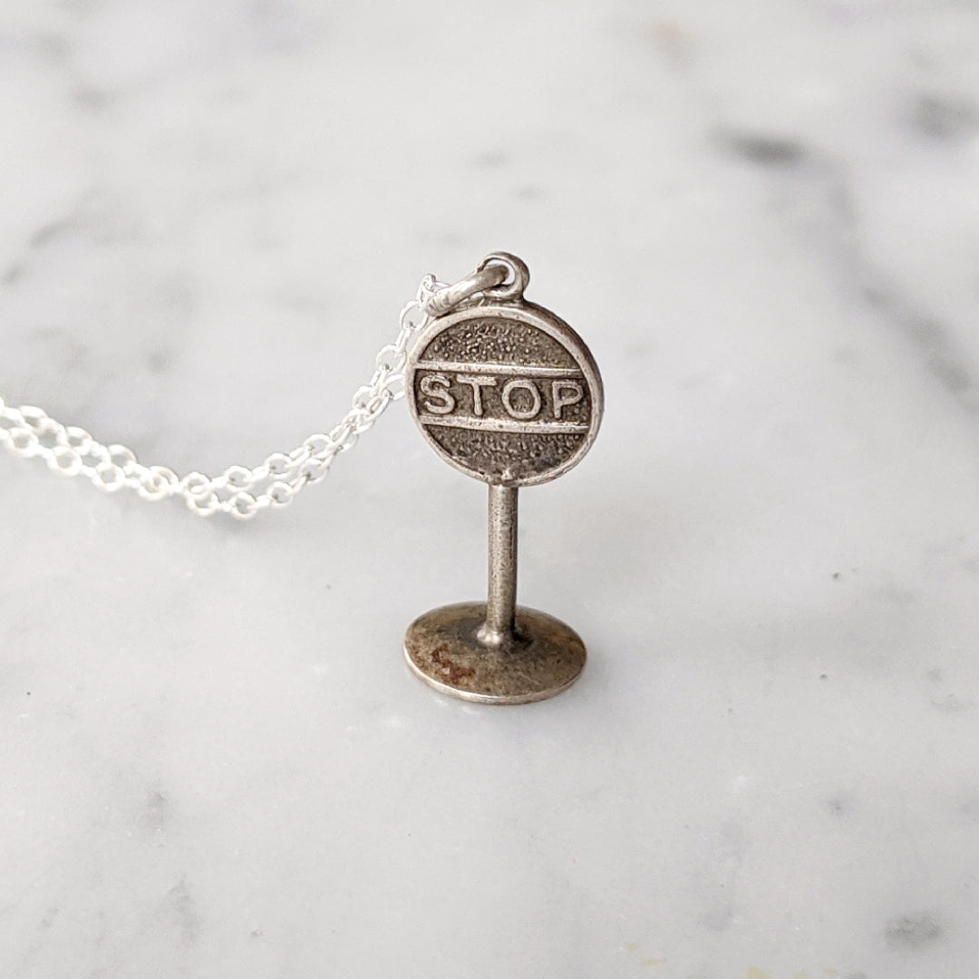 Vintage sterling silver stop sign charm hanging from a sterling silver chain.