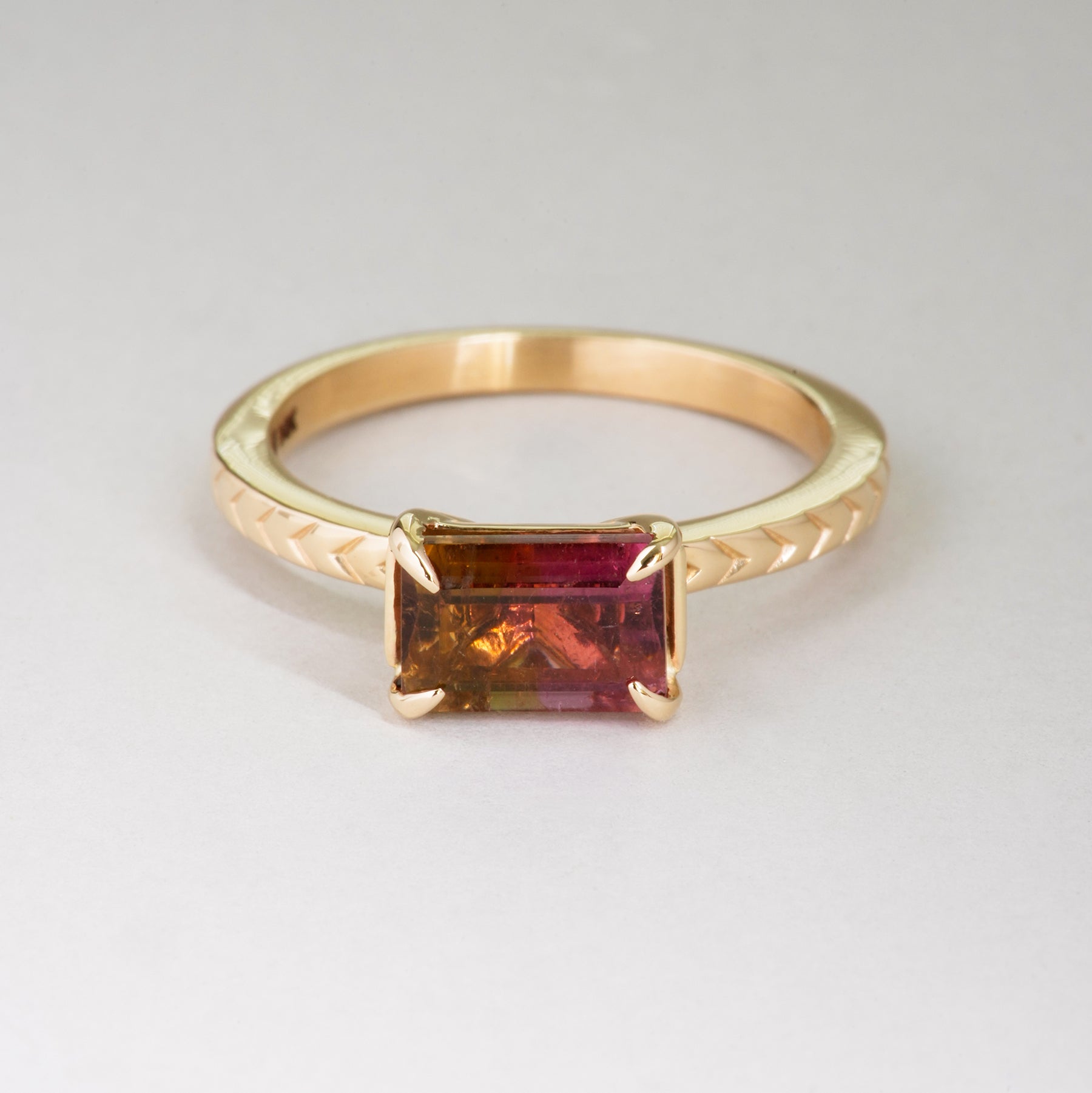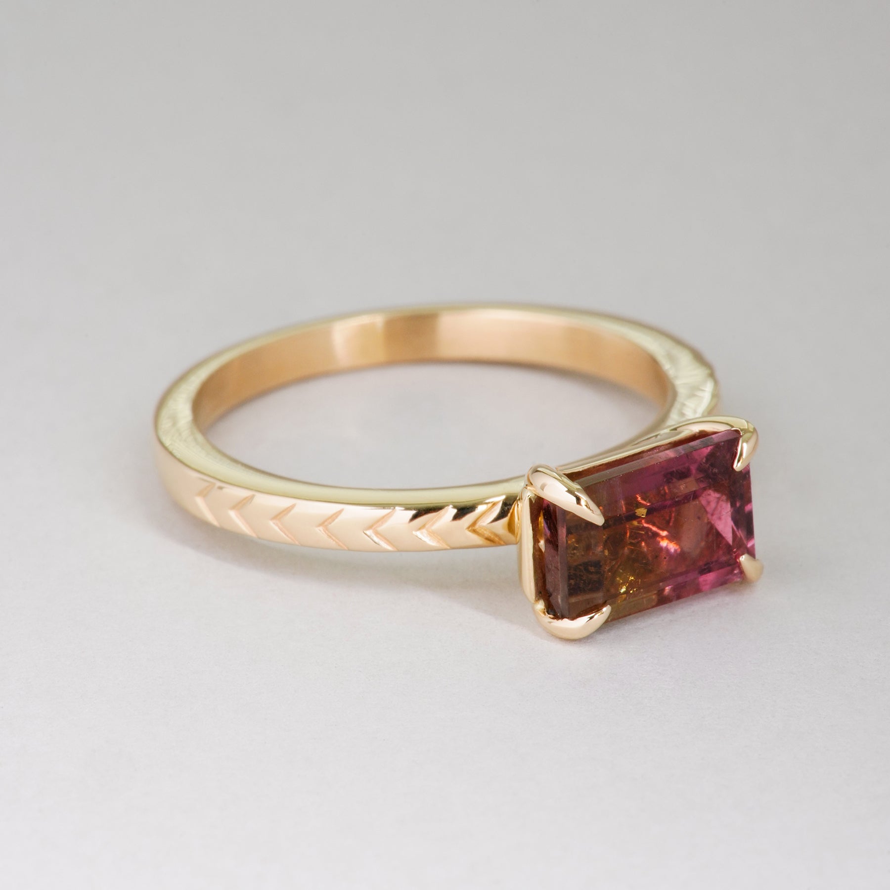 A stunning 1.57ct watermelon tourmaline on a 14k gold chevron detailed band.