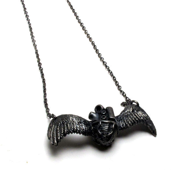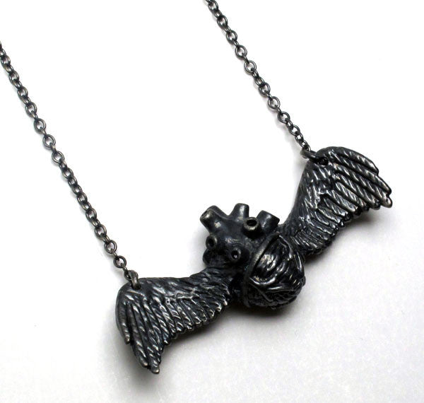 Anatomically correct fully detailed oxidized silver brass cast winged heart hanging from an 18" adjustable chain.